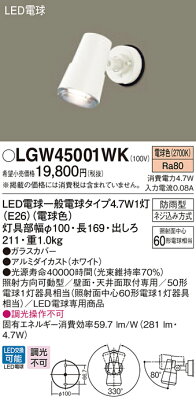 ページ内のPC版表示をクリックしてご確認ください【4色カラーバリエーションはこちらをクリック】 ●スポットライト センサー無し特集●スポットライト 人感センサー特集●スポットライト スパイクタイプ特集 ●スポットライト 看板照明特集●スポットライト 防犯灯特集●Panasonic照明TOPへ移動 ●関連商品 スポットライト LGW45001BK オフブラック10,450円スポットライト LGW45001SF シルバーメタリック10,450円スポットライト LGW45001WK ホワイト10,450円スポットライト LGW45001YK プラチナメタリック10,450円