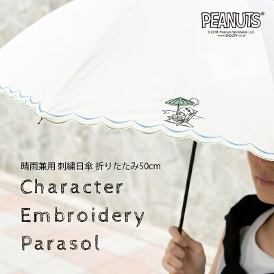 PEANUTS スヌーピー グッズ 50cm 折りたたみ傘 キャラクター晴雨兼用 刺繍 日傘スヌーピー/ウッドストックUVカット率99%以上/遮光率99%以上/遮熱効果/UPF50+/はっ水加工(母の日 プレゼント ギフト SNOOPY woodstock かさ おしゃれ かわいい レディース パラソル)