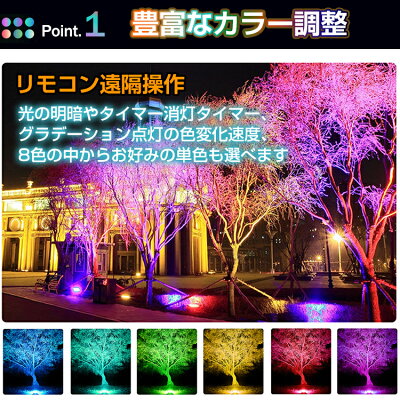 地面差込とネジ固定の2種類の設置法ができます ◆分離型でライトまでの配線は約8m ◆リモコンで、光の色・明るさ・色変化速度を遠隔設定 ◆フル充電で一晩中点灯可能 ◆点灯タイマーは4Hから。