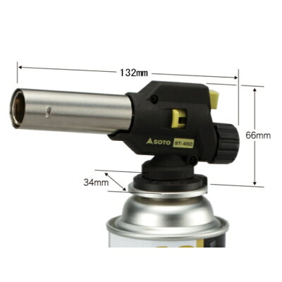 ■寸法:長さ132×高さ66×幅34mm(ボンベ除く) ■重量:153g(本体のみ) ■火口径:直径22mm ■発熱量:2.1kW(1,820kcal/h)(ST-760使用時)、1.8kW(1,550kcal/h)(ST-700使用時) ■炎温度:最高1,300℃最低900℃ ■使用燃料:SOTO製品専用容器(CB缶) ■燃焼時間:約1.5時間(ST-760使用時)、約2.0時間(ST-700使用時) ※燃焼時間は30分の連続燃焼データより換算。