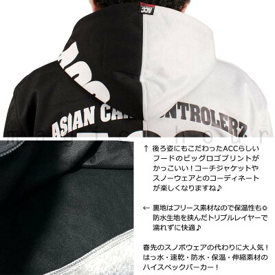 ◆ ACC エーシーシー 撥水 防水 ロング丈 パーカー ブランド ウェア フルジップ ジッパー フーディー メンズ レディース 大きいサイズ対応 TALL ZIP EAGLE ◆ スノボブランドが提案するはっ水・防風・保温性抜群の3レイヤーボンディングトールパーカー。
